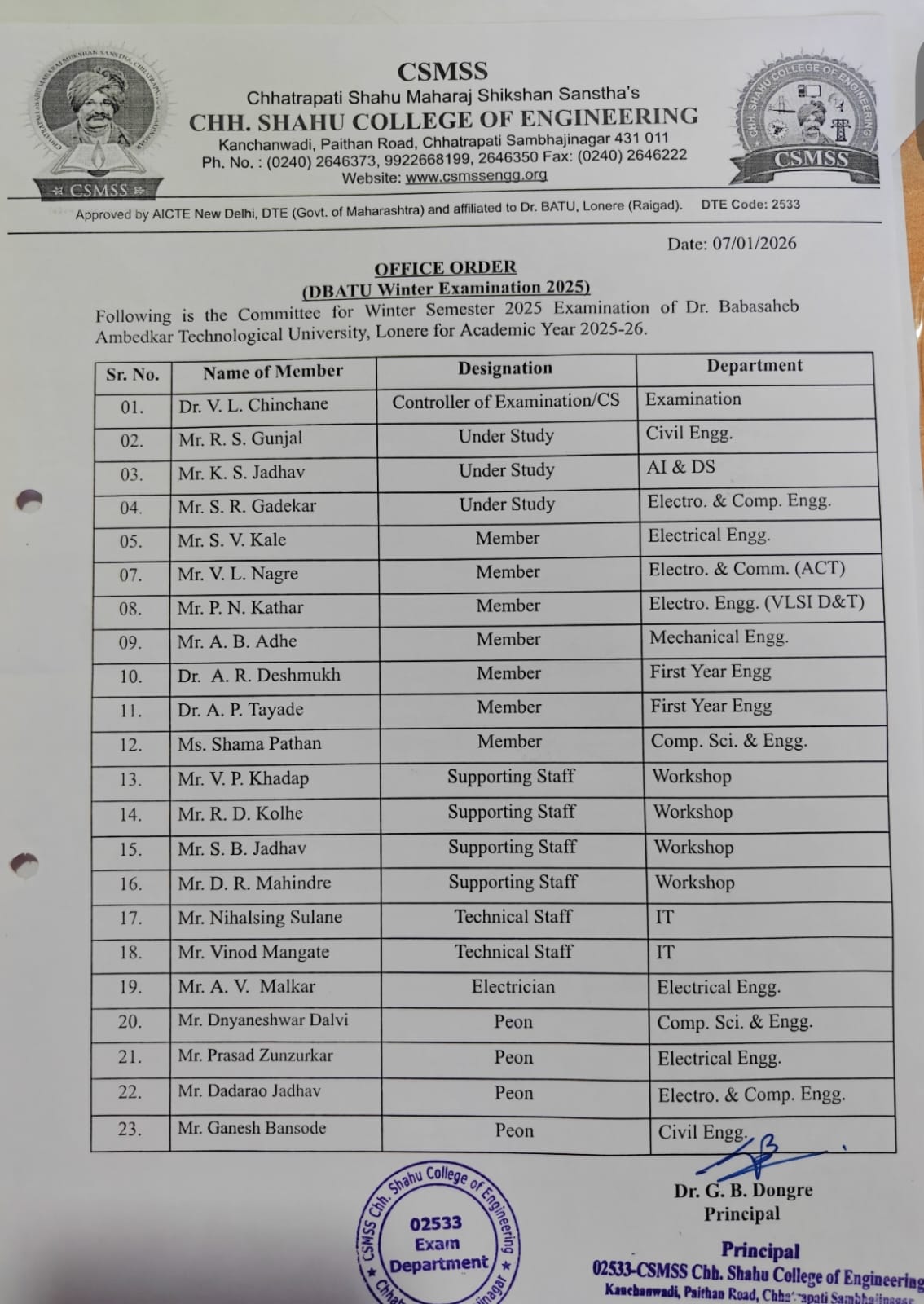 The Examination Cell at CSMSS Chh. Shahu College of Engineering is committed to conducting all examinations in a fair, transparent, and timely manner in strict adherence to the guidelines of Dr. Babasaheb Ambedkar Technological University (DBATU). We strive to uphold academic integrity, ensure confidentiality, and facilitate smooth examination and evaluation processes for the overall academic excellence of the institution.